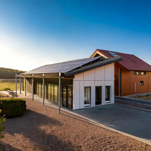 La conception intègre la notion d’auto-suffisance avec une enveloppe thermique en béton de chanvre préfabriquée, une double toiture en soufflet intégrant subtilement le système de ventilation naturel et les supports pour les systèmes photovoltaïques.