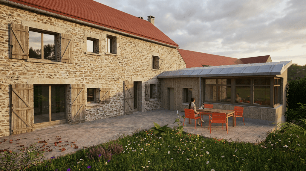 Discrète greffe dans l’emprise d’une dépendance existante pour la création d’un espace adapté au vieillissement.