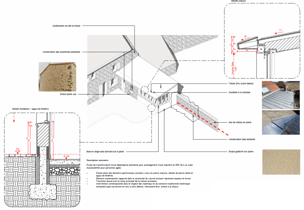 Conception éco-responsable avec usage de matériaux biosourcés locaux ; Réemploi de pierres issues des démolitions et béton de chanvre coulé en place et structure en bois préfabriquée.