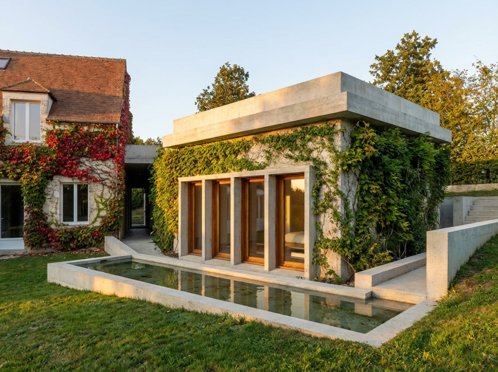 Proposition originale non retenue par nos clients pour l’extension d’une maison Briarde de charme, comprenant une Master Bedroom, une pièce d’Archivage et un bureau. Ensemble semi-enterré avec un patio à l’arrière et un belvédère sur le jardin côté avant ; dispositif offrant une ambiance de charme rythmée par l’ambiance extérieure.